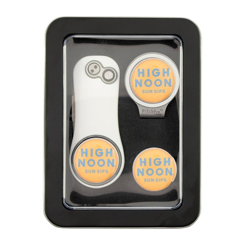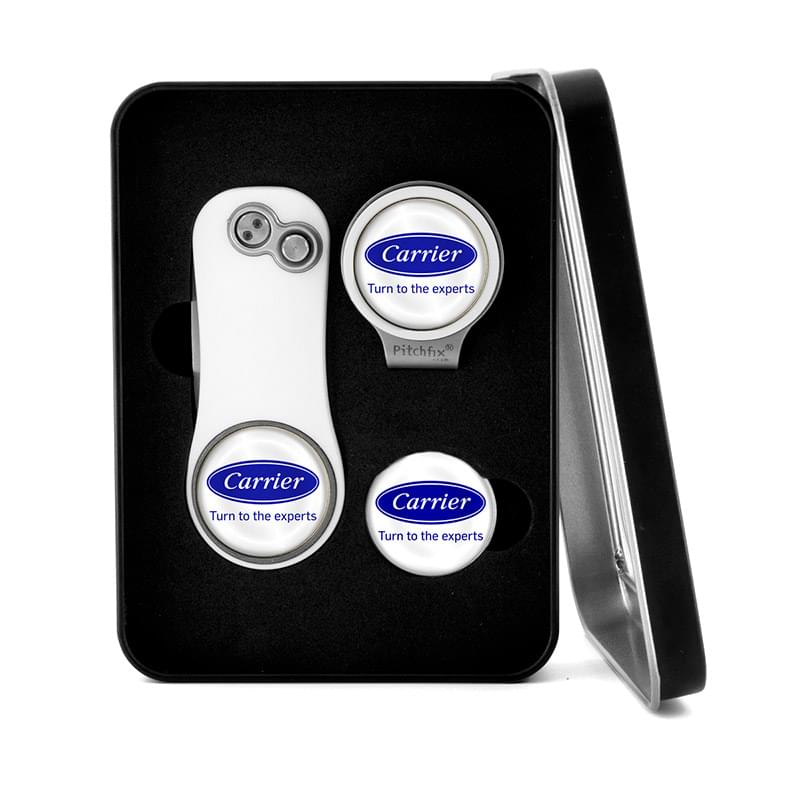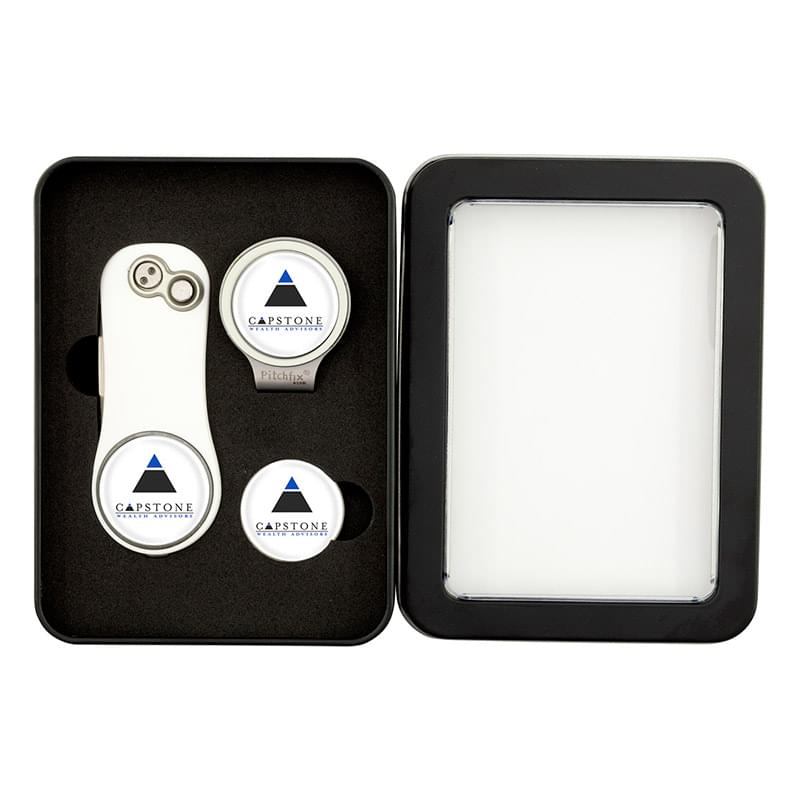 Create a swinging giveaway for charity or corporate golf tournaments and other golfing events with the Pitchfix Hybrid 2.0 Divot Tool Window Gift Set. Inside of this handsome window tin you'll discover the best-selling Pitchfix Hybrid 2.0 Golf Divot Tool with removable ball marker, matching Pitchfix Hat Clip with removable ball marker, and an additional ball marker. All ball markers include a full color imprint with protective poly dome.
