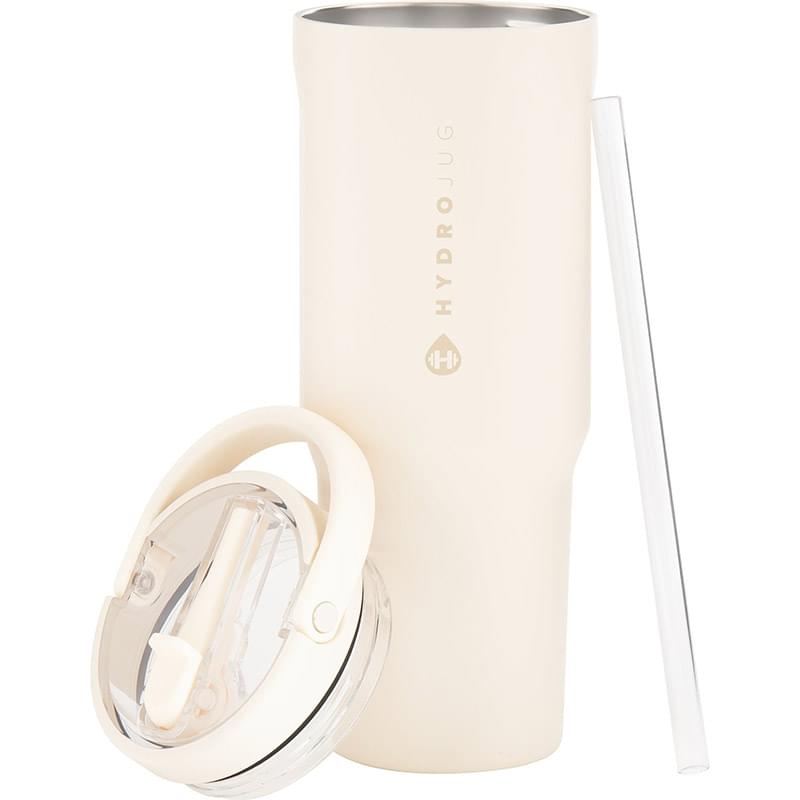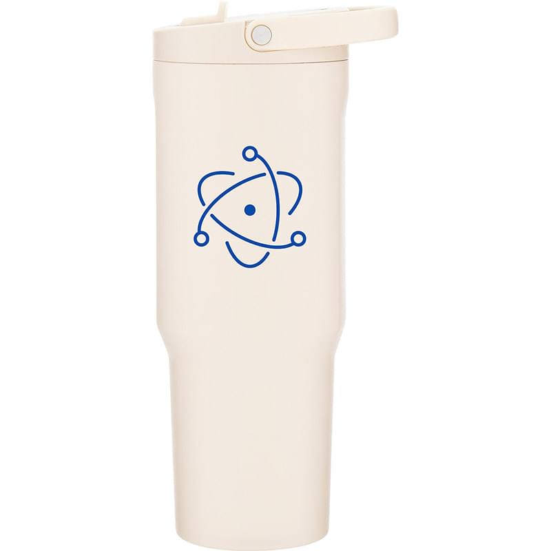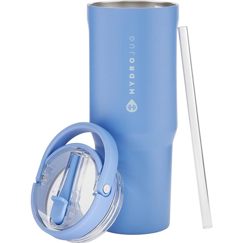 32 oz double wall 18/8 stainless steel thermal tumbler with copper vacuum insulation, threaded lid, matching flip-up spout, soft straw, carrying handle, and powder coated finish