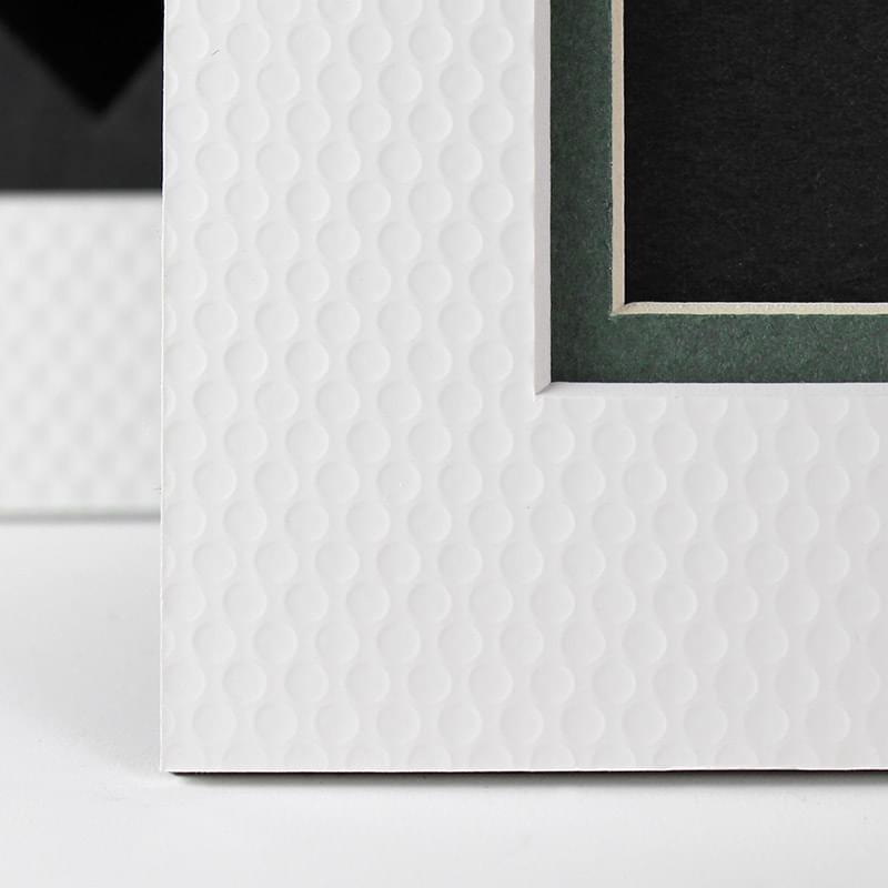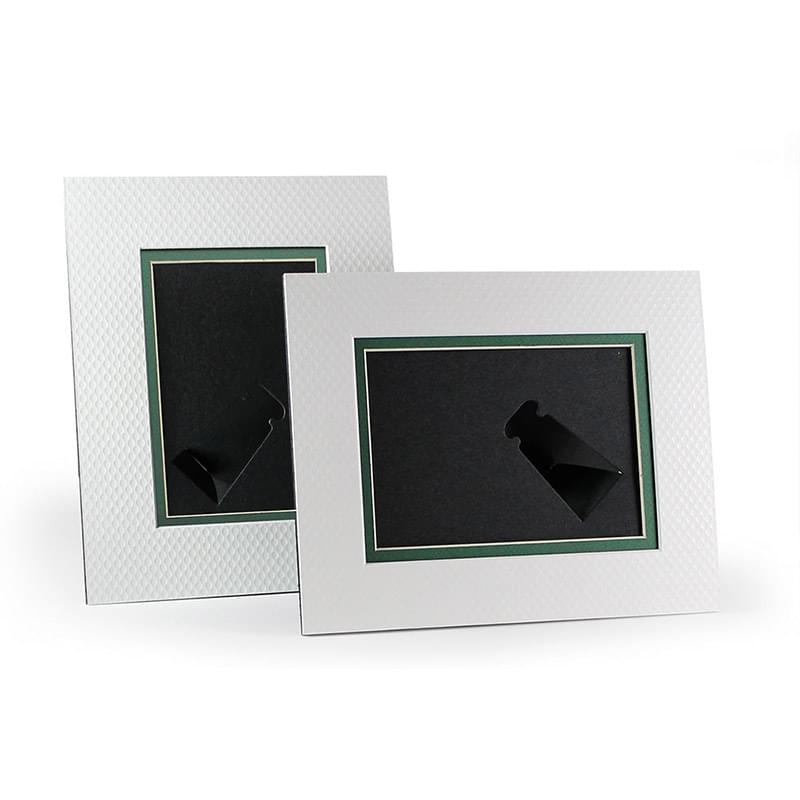 Make your golf event a memorable one with Golf Ball Textured Photo Frame. 8" x 10" Heavy-duty double mat board stock is dimpled like a golf ball and has a Forest Green inside accent mat. Double mat frame with easel accommodates a 5" x 7" horizontal or vertical photo. Gold foil hot-stamped imprint included. Also available in a single mat style.