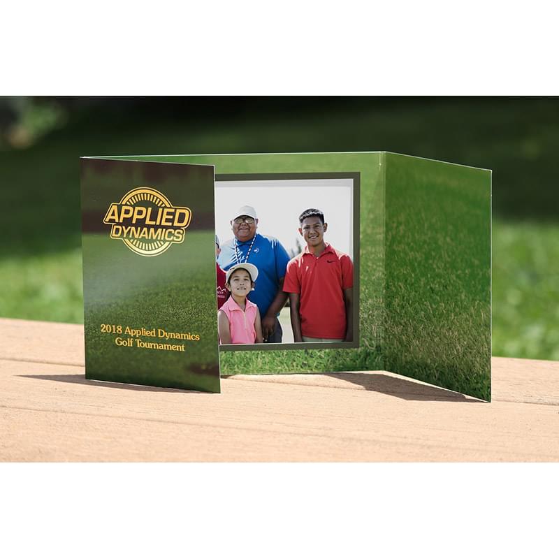 Vertical format Golf Gatefold Event Photo Holders feature a stock golf design and accommodates one 5" x 7" photo. Gold or Silver foil stamped imprint is standard.